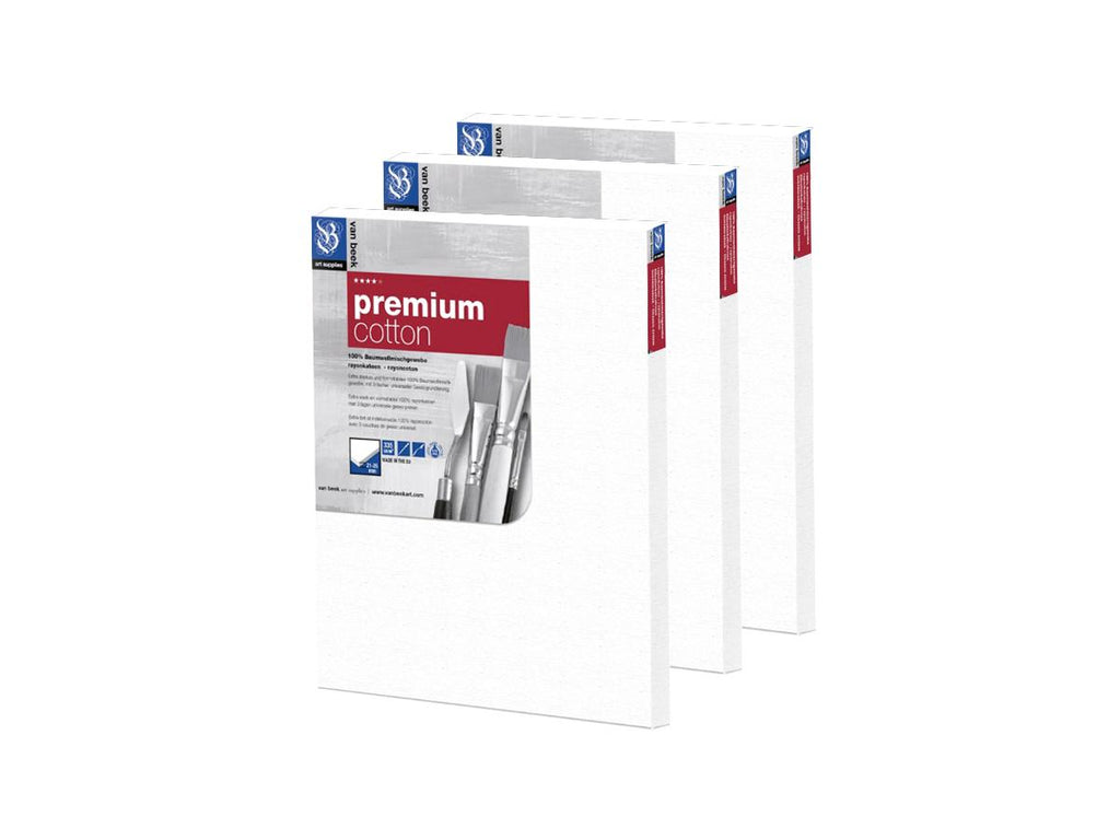 Van Beek Premium katoenen doeken zijn geniet aan de achterkant waardoor de zijkanten (20mm breed) vrij te beschilderen zijn en ze zonder lijst gepresenteerd kunnen worden.Van Beek Premium katoenen Xtra doeken zijn geniet aan de achterkant van de extra dikke spielat (ook wel 3D-lat genoemd) waardoor de zijkanten (40mm breed) vrij te beschilderen zijn en ze makkelijk zonder lijst gepresenteerd kunnen worden. Van Beek Premium doeken en Van Beek premium Xtra doeken zijn stevige doeken die universeel geprimed zijn (2 lijmlagen en 2 lagen primer), het schildersdoek is van 100% eerste kwaliteit (300g/m2 en 21/21 threads/cm2) katoen!